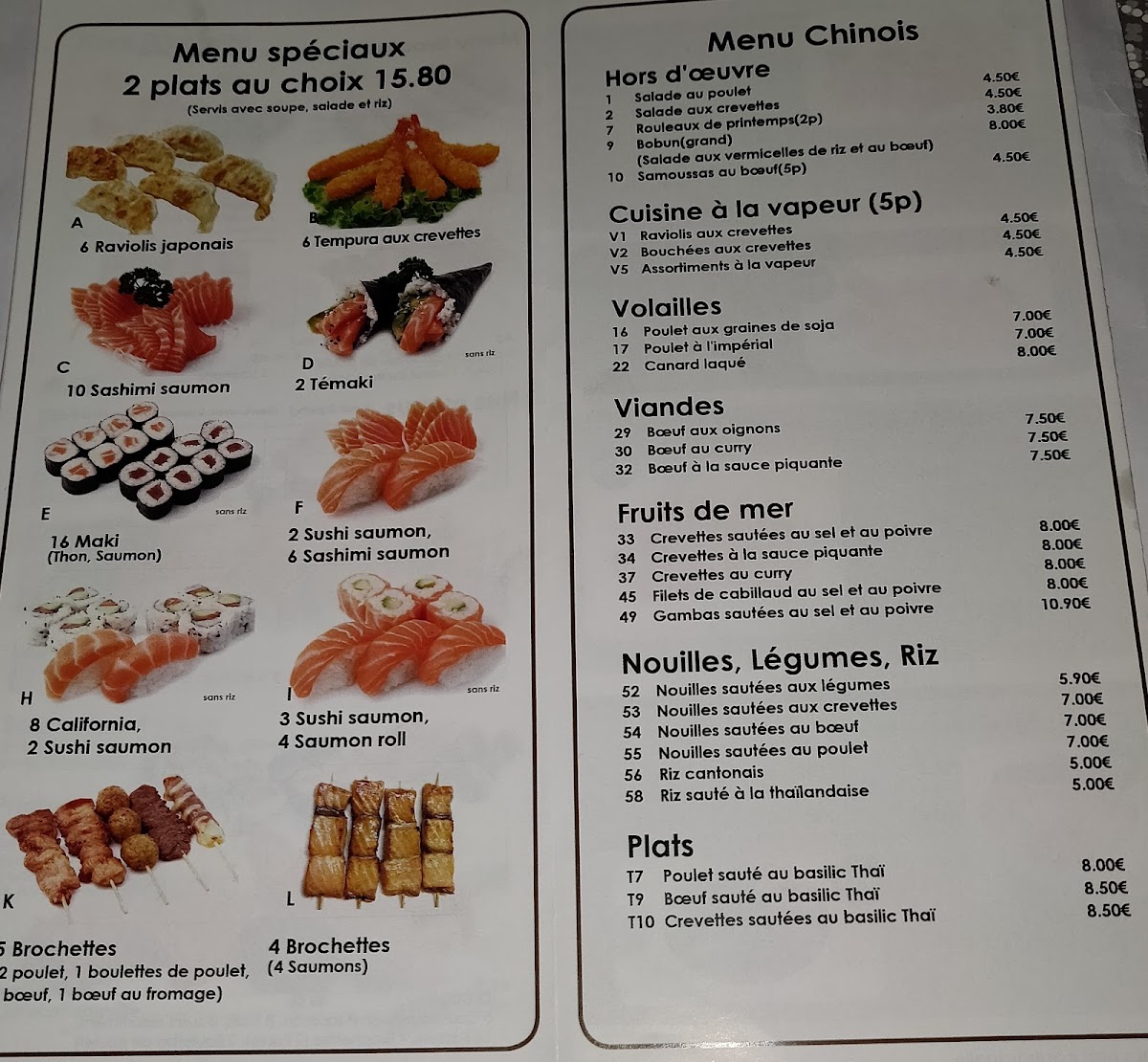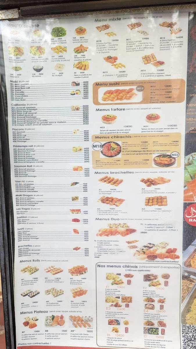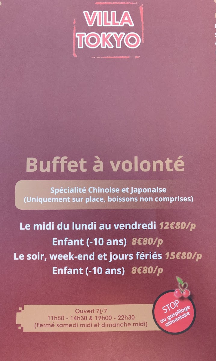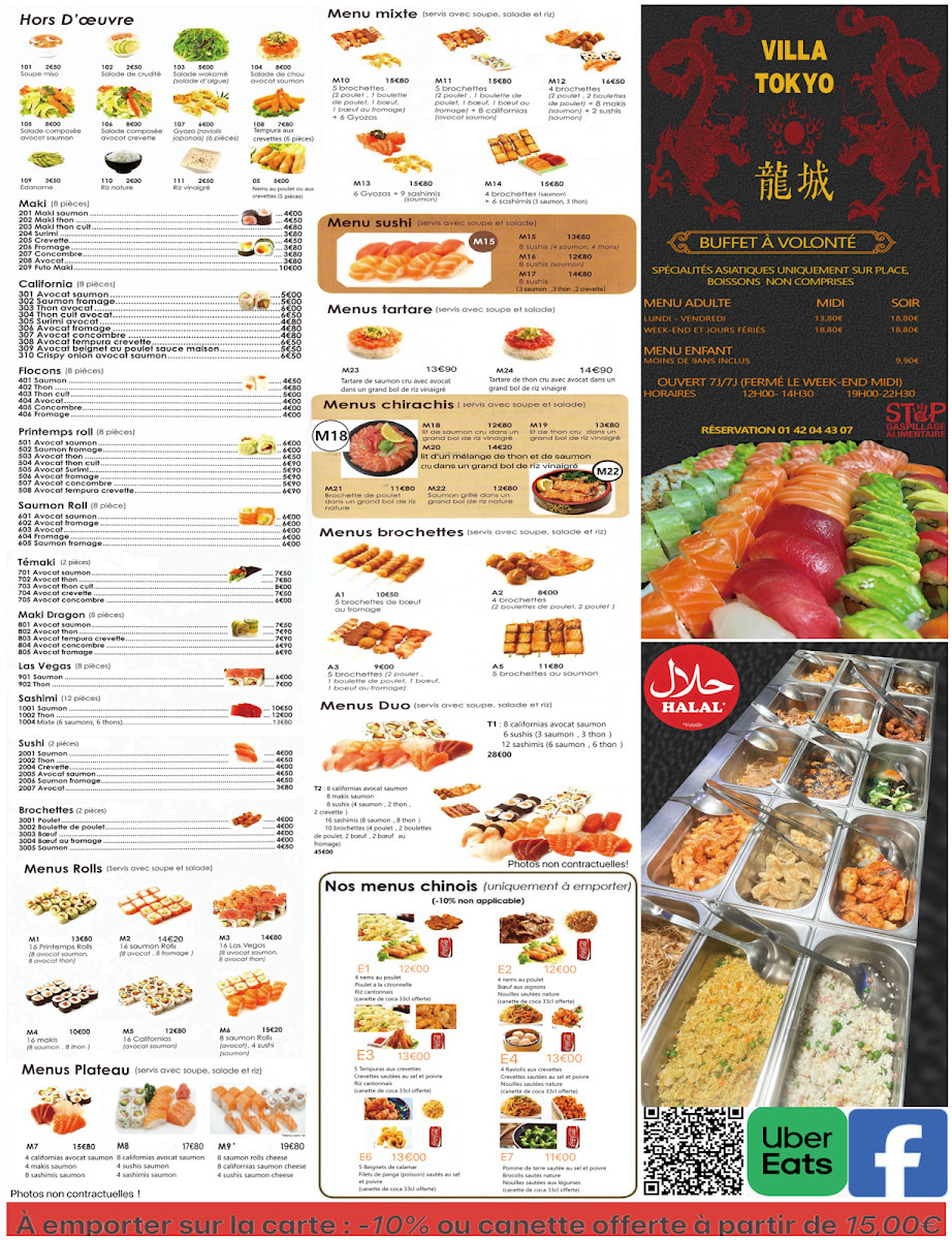 The menu at Villa Tokyo offers a variety of dishes combining Chinese and Japanese culinary traditions, presented primarily in a buffet format. Guests can explore a range of options including salads, different types of dim sum such as gyoza, steamed dumplings, and spring rolls (nems), as well as brochettes and mixed platters featuring meatballs, vegetables, and rice. The selection also includes sushi and light desserts like flan.