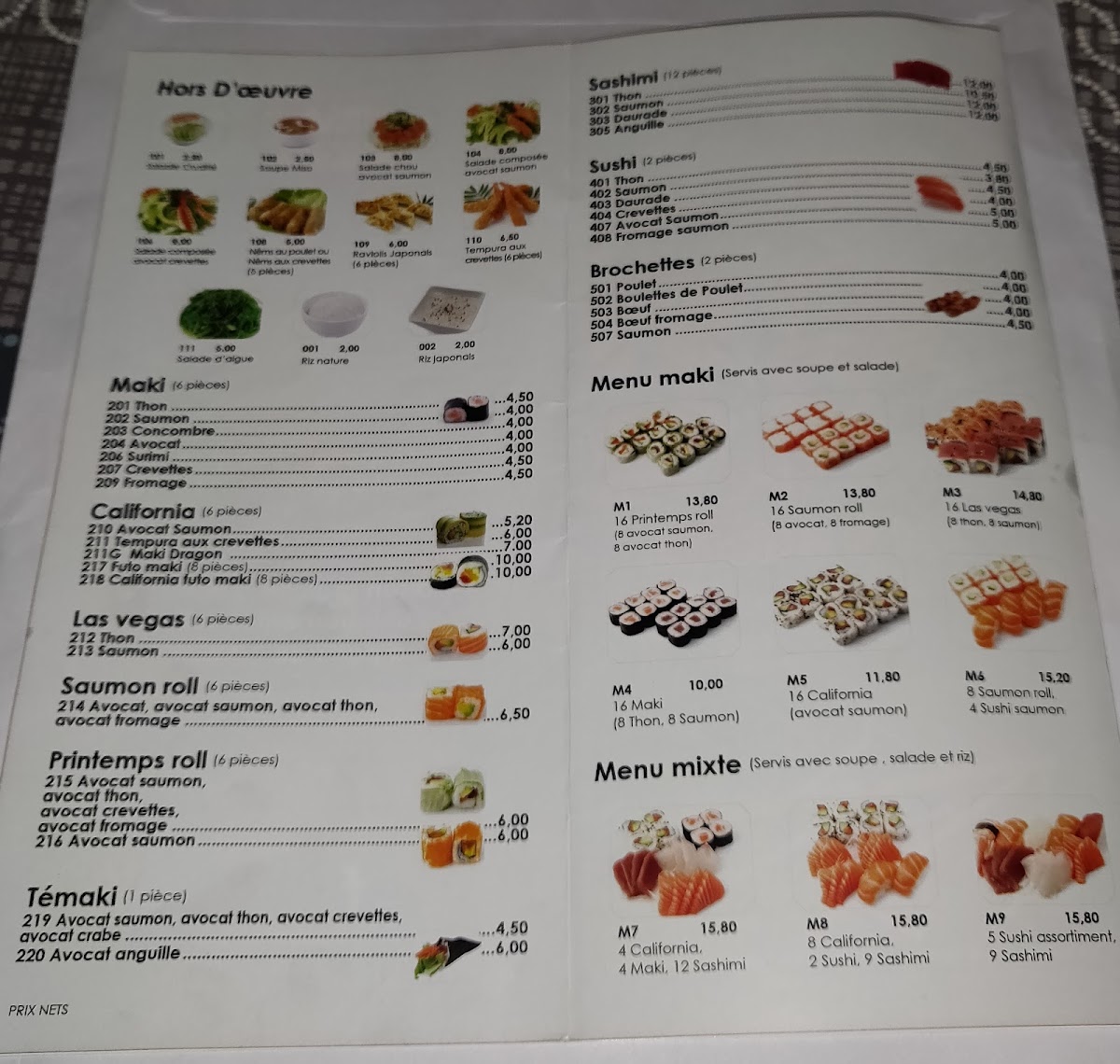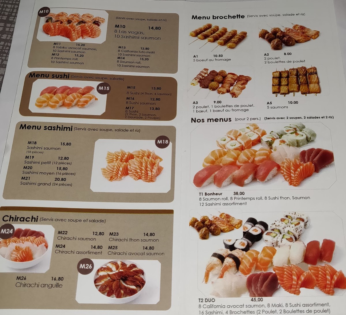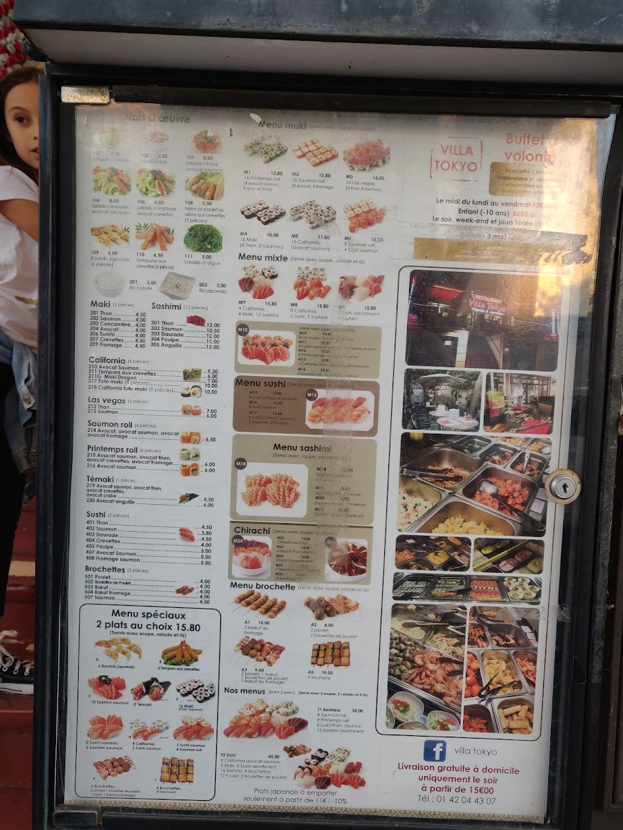 The menu at Villa Tokyo offers a variety of dishes combining Chinese and Japanese culinary traditions, presented primarily in a buffet format. Guests can explore a range of options including salads, different types of dim sum such as gyoza, steamed dumplings, and spring rolls (nems), as well as brochettes and mixed platters featuring meatballs, vegetables, and rice. The selection also includes sushi and light desserts like flan.
